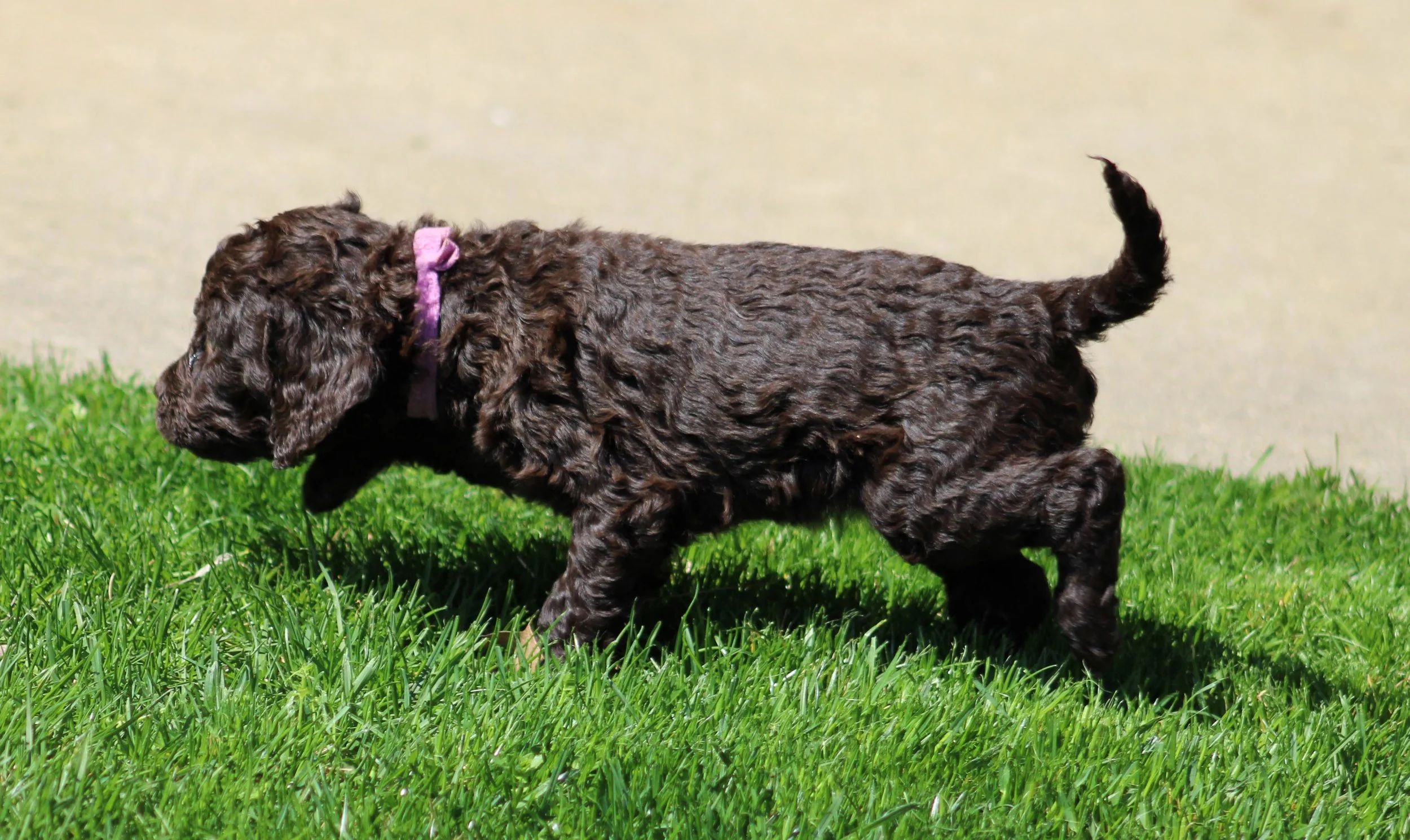 The pups out on a walk about at six weeks of age.