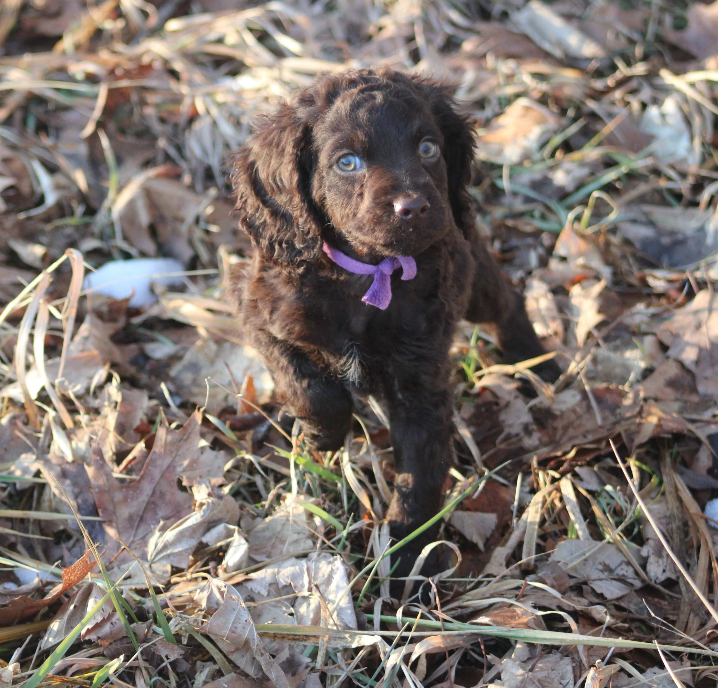 The outside temperature is in the single digits and below. There is a foot or more of snow in the yard. So, how do you introduce the pups to things like grass and leaves? Bring them inside! It is a little innovative but it worked and the pups loved the leaves.